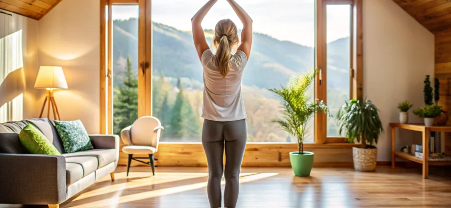 A person in a comfortable home setting performing the Mountain Pose with arms raised, showing calm and focus, no text or branding visible